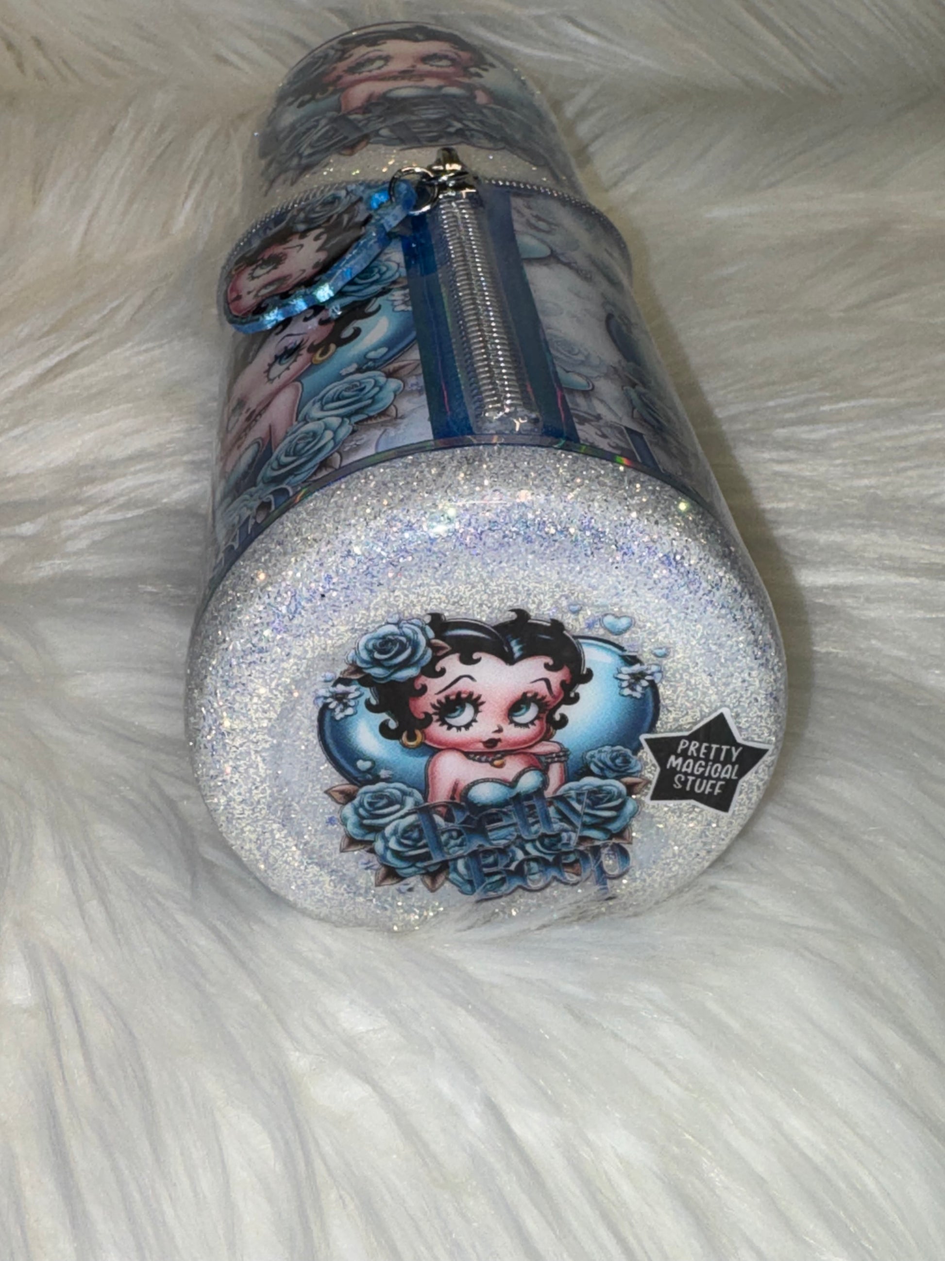 20 Oz zipper tumbler with lid and straw. Keeps drinks cold or hot for hours.